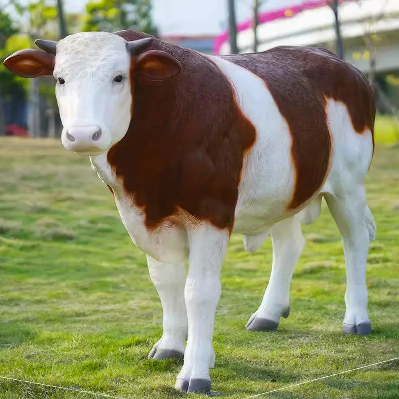 Simulerte kuskulpturer bruker mye moderne materialer som harpiks, glassfiber og rustfritt stål. Disse materialene har ikke bare fordelene med høy styrke, korrosjonsbestandighet og enkel behandling, men kan også oppnå realistiske tekstur- og fargeeffekter gjennom overflatebehandlingsteknologi.