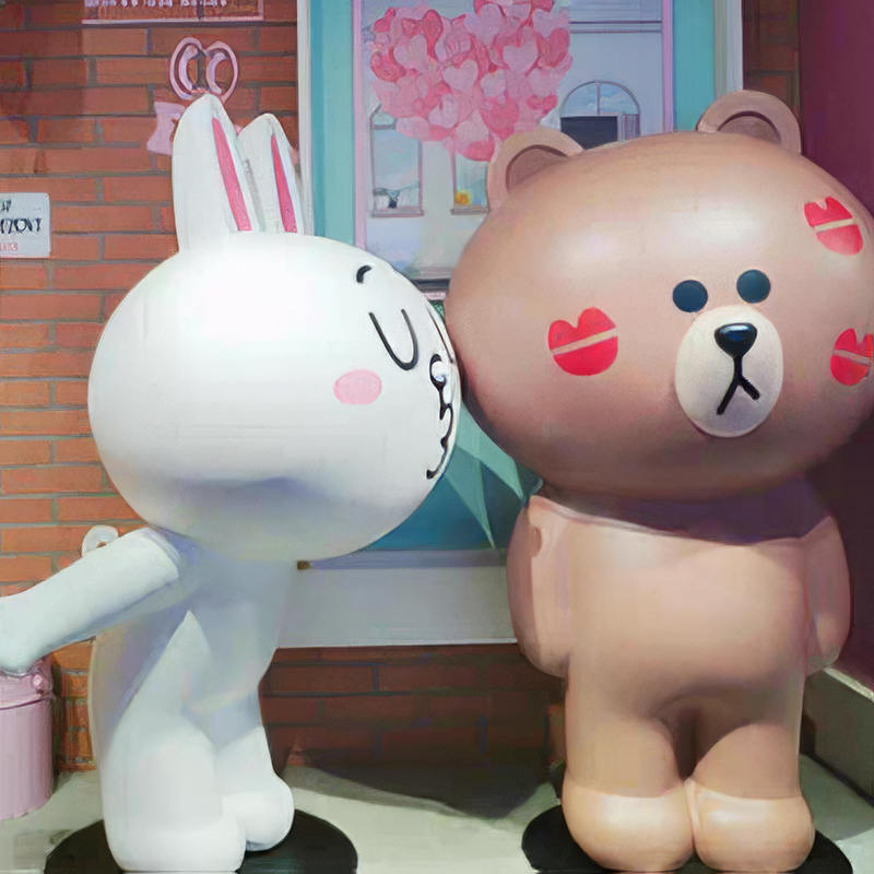 Cartoon Coni Rabbit and Brown Bear -statuer har både vakkert utseende og utsøkt håndverk. De kan plasseres i melkesbutikker, parker, dessertbutikker, kjøpesentre og andre steder for å tiltrekke folk til å sjekke inn og ta bilder.